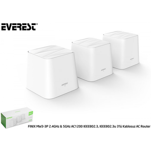 Everest FINIX MW3-3P 2.4GHz 5GHz AC1200 IEEE802.3, IEEE802.3u 3lü Mesh Kablosuz AC Router ; Kesintisiz 4K videolar için gigabit hızında. 1200Mbps'a kadar veri hızı sunan MW3, 5 GHz ağ erişimine öncelik tanıyarak HD kalitesinde  kesintisiz ve gecikmesiz 4K video keyfi sunar.